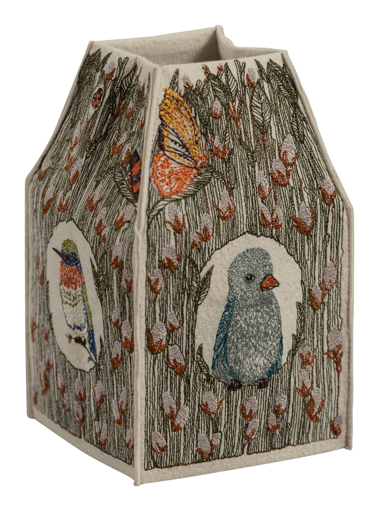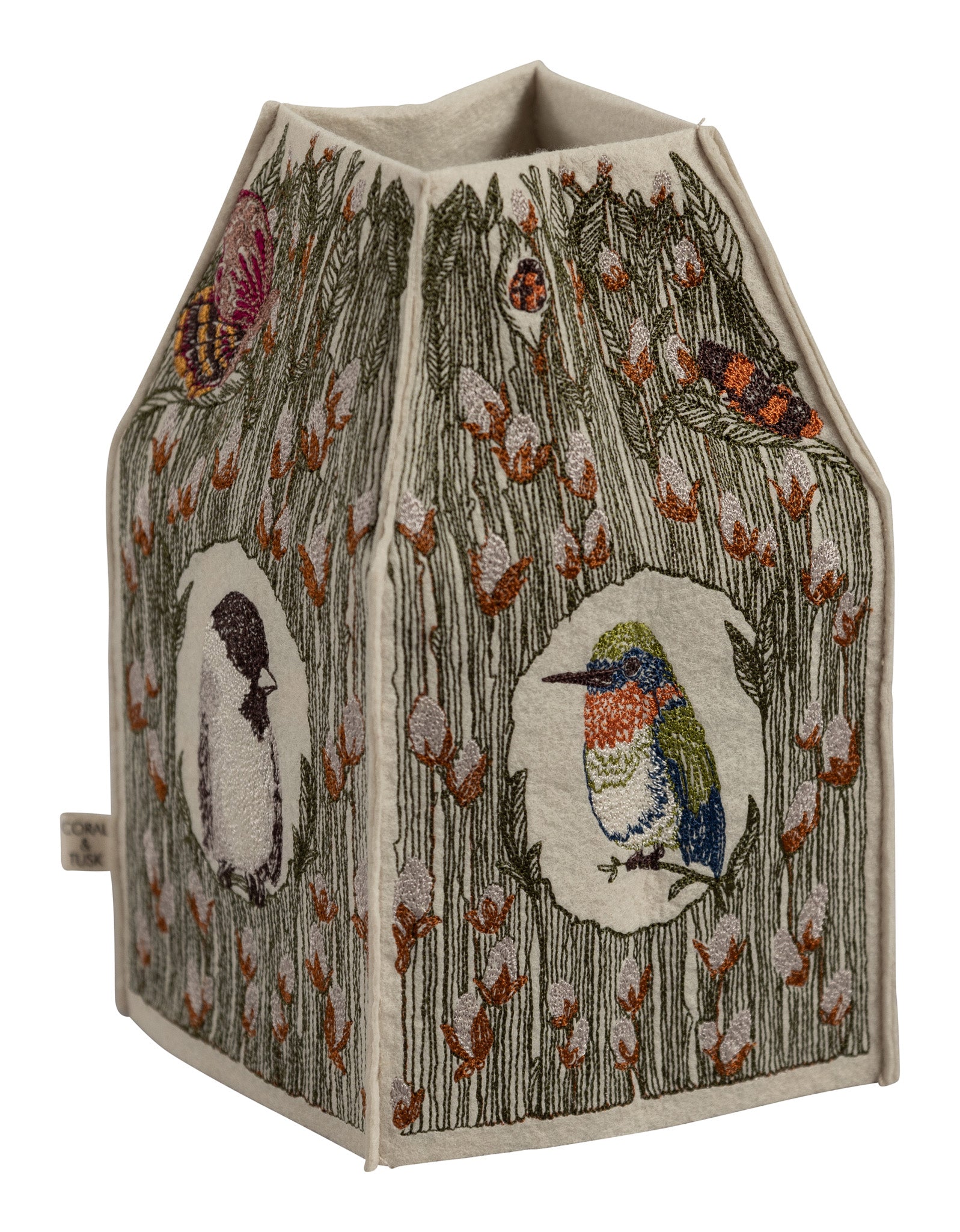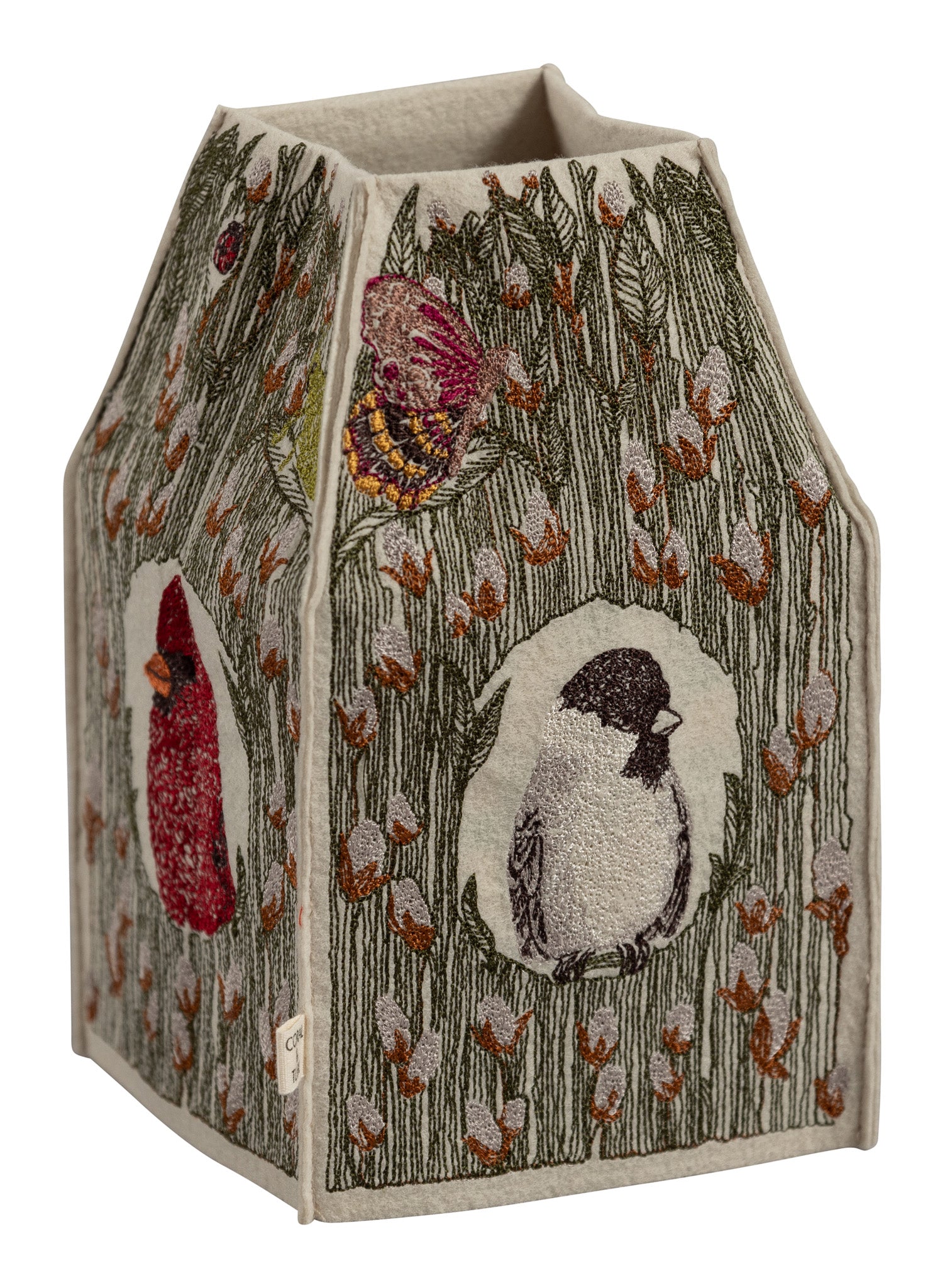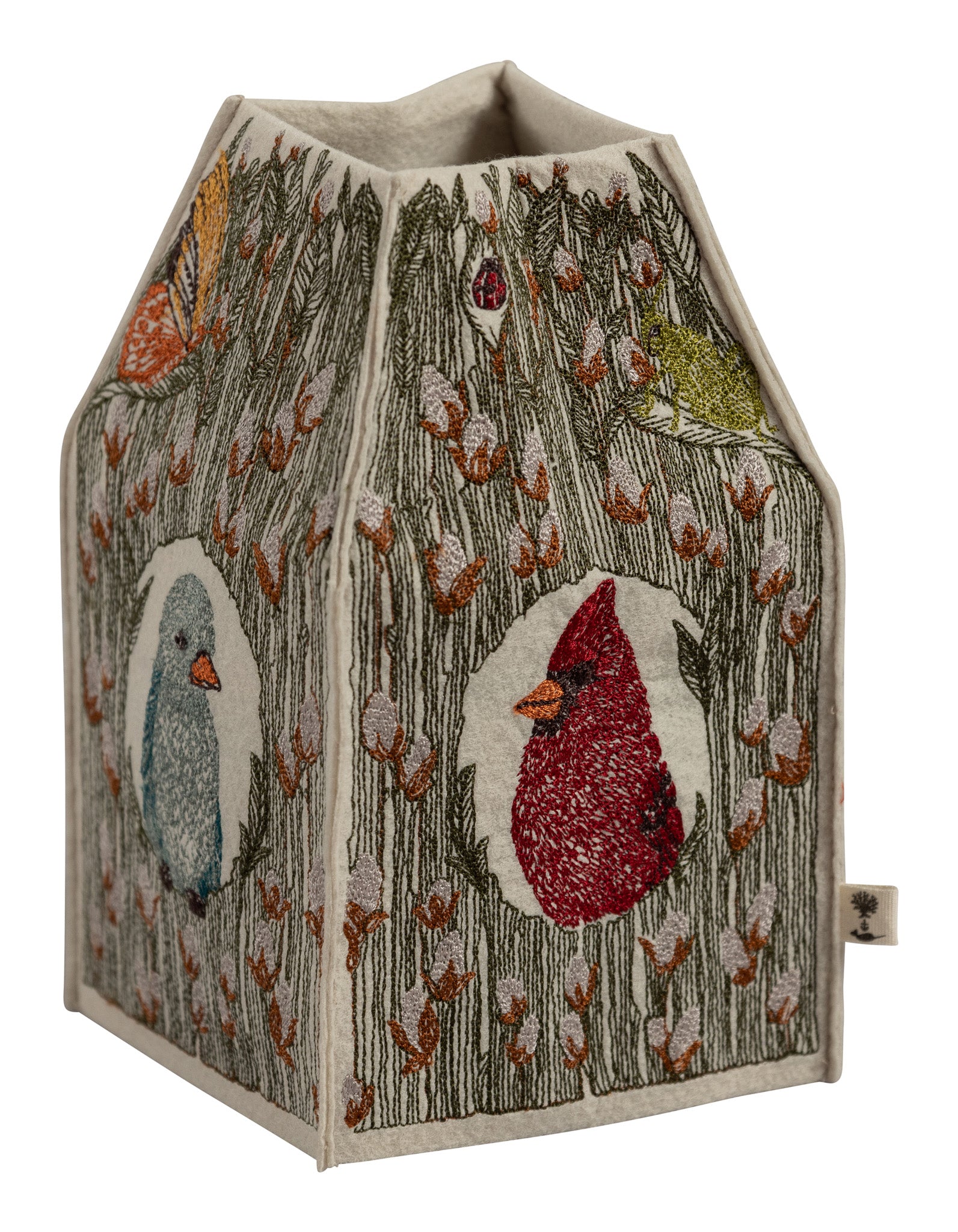 Our newest tissue box cover is here! Four birds make a beautiful home in a thicket of pussy willows. Butterflies, ladybugs, crickets, and caterpillars inch along the branches and enjoy the catkin flowers. On each side of this tissue box cover find a different bird: a bluebird, cardinal, black-capped chickadee, and hummingbird. Embroidered on felt.