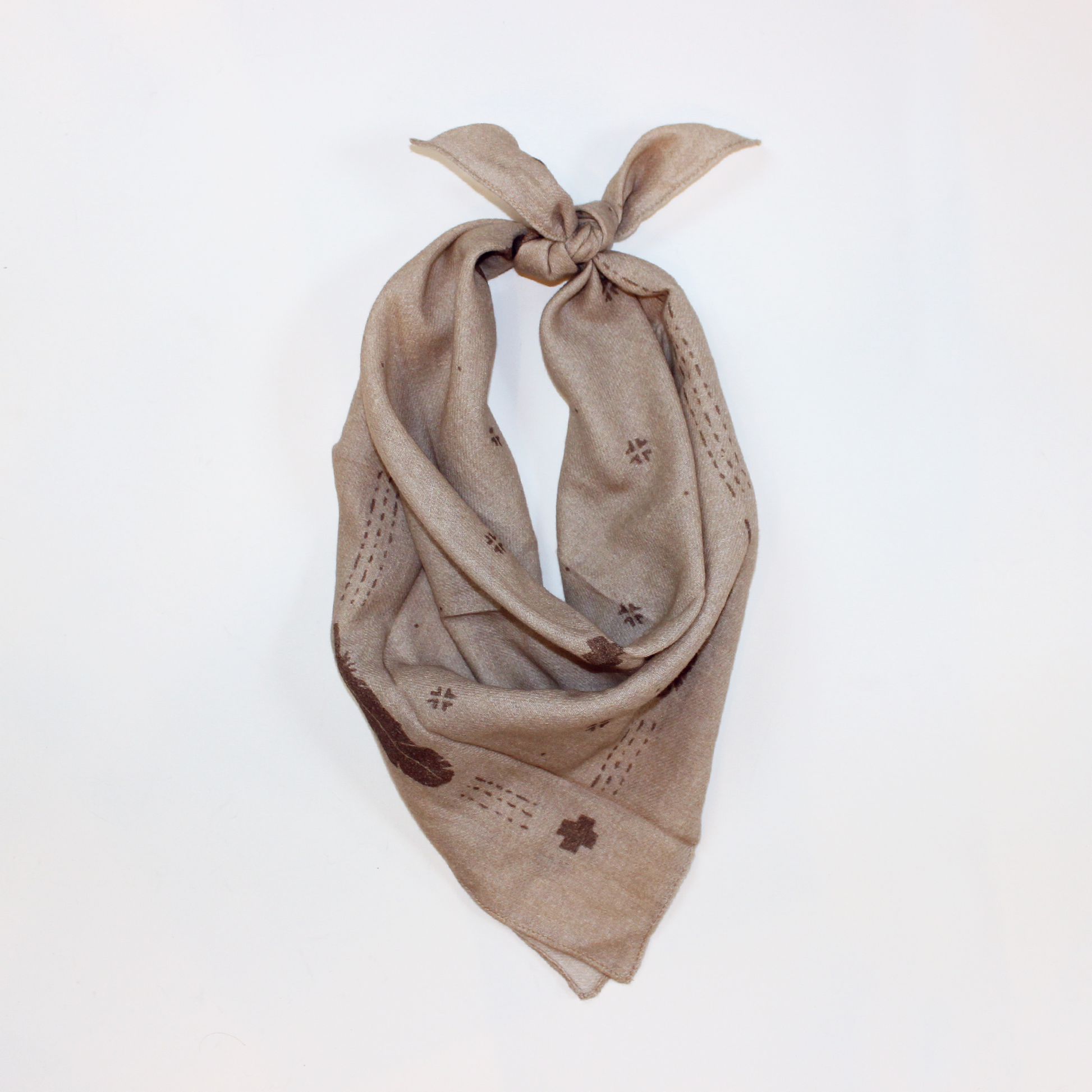 A bandana-sized scarf made of a luxurious cotton and cashmere blend. The scarf design was crafted from Anna's hand-carved block prints in her Bozeman studio.